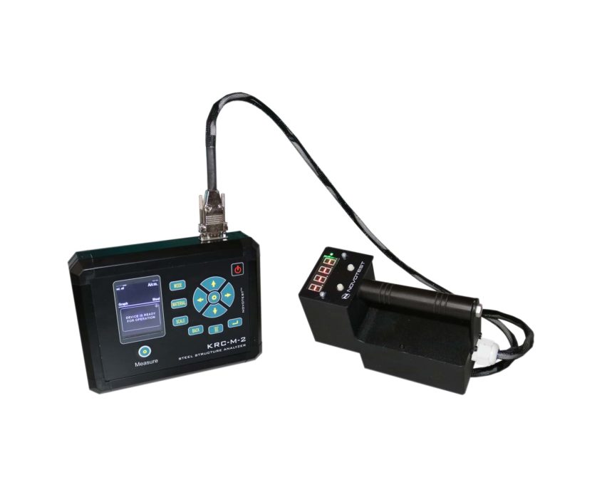 Steel structure analyzer is used for determination of mechanical properties, and measurement the hardness of metal products, as well as measurements of products of ferromagnetic alloys in the presence of correlations between the studied parameters. In addition, the device is used for testing the surface layer of ferromagnetic material for grading the metal in steel grades. KRC-M2 has an electromagnet transmitter with integrated Hall sensor and removable pole tips.