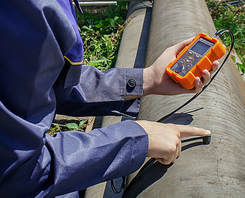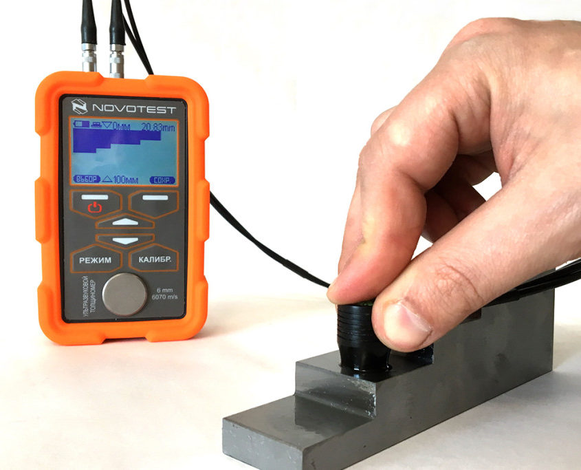 The method is based on the property of materials to conduct ultrasound, ultrasonic waves are excited with the piezoceramic plate in the transducer and penetrates into the material through the couplant, then reflected from the bottom surface of the tested sample, and returns to the transducer. Based on the obtained sound transit time in the material, the device calculates the thickness in accordance with the velocity of propagation of ultrasonic waves in the test sample. The thickness value is displayed on the device’s display, the measurement process takes about 1 second.
